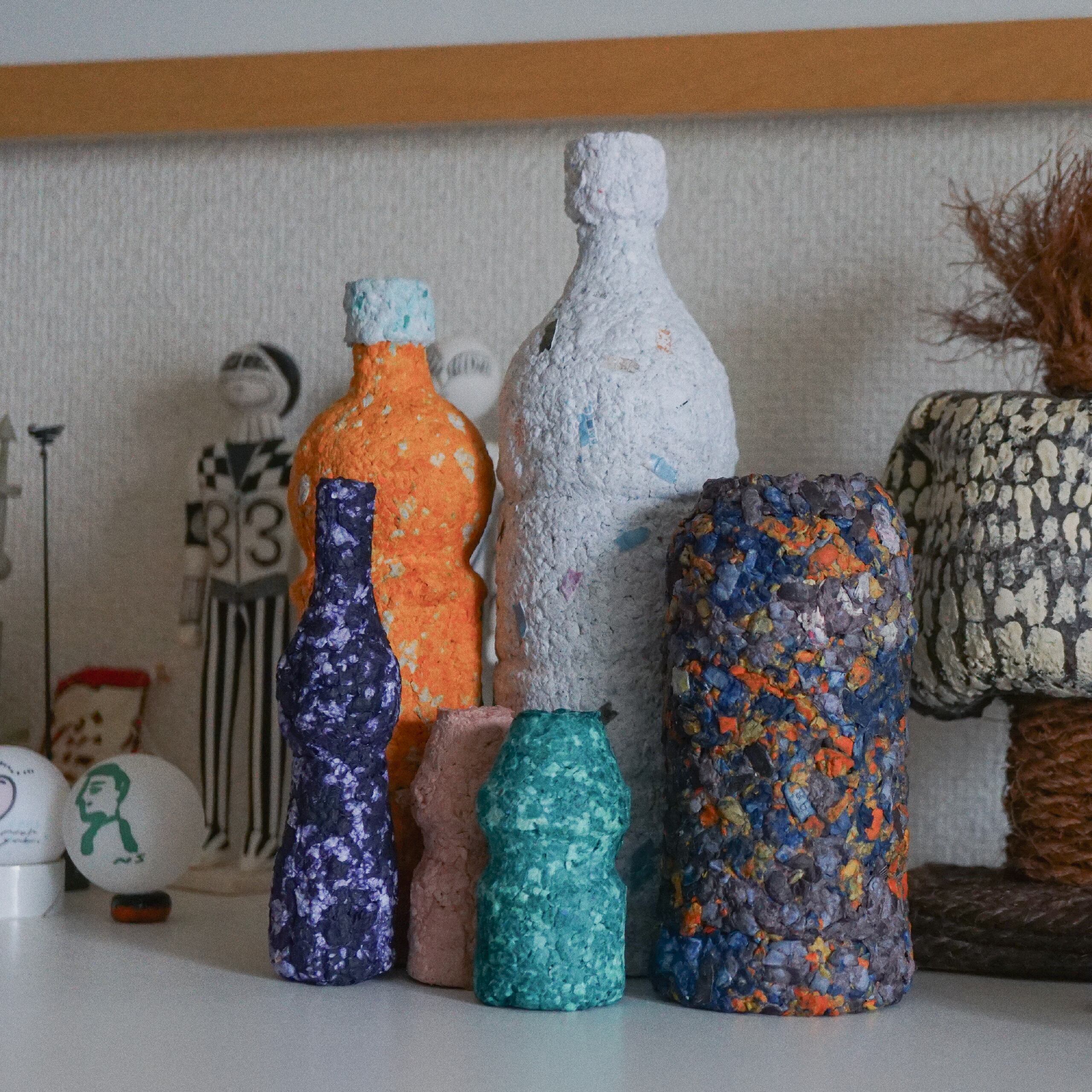 ぼろぼろと崩れやすい自作の紙粘土を既製品の空き容器を型にしながら作品を制作しました。
